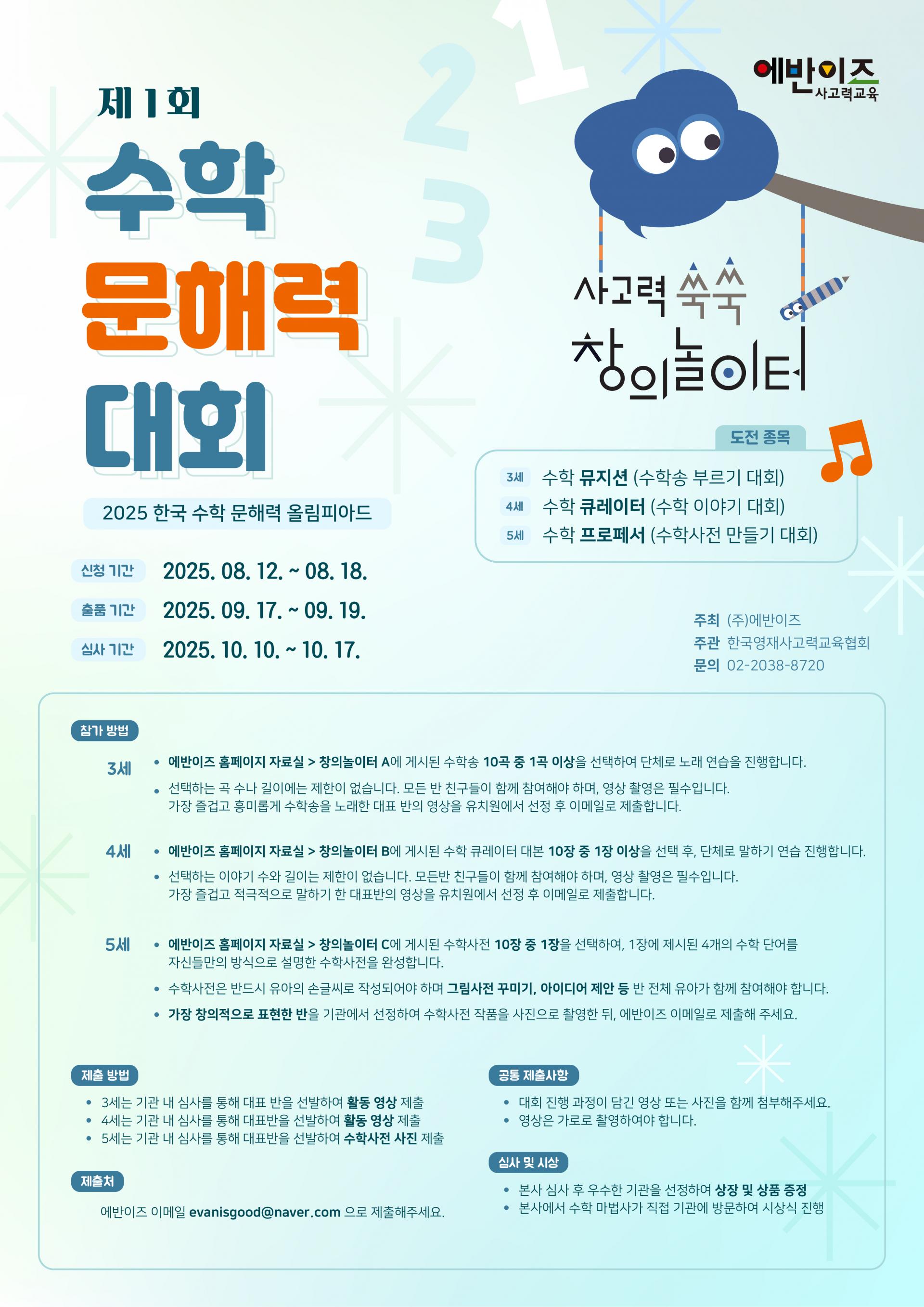 에반이즈가 주최하고 한국 영재 사고력 협회가 주관하는 『2025 제1회 수학 문해력 대회』가 개최됩니다.